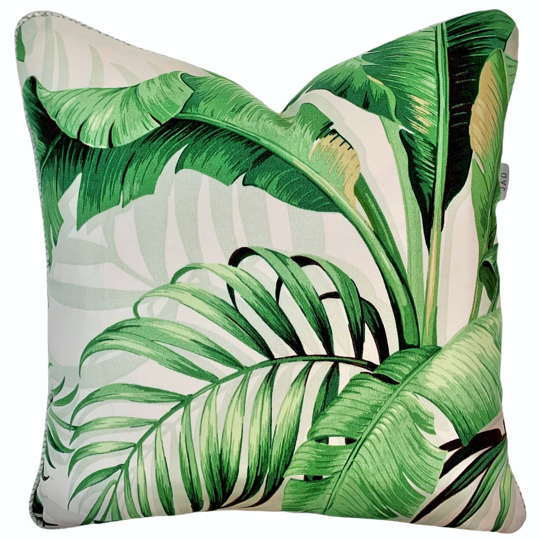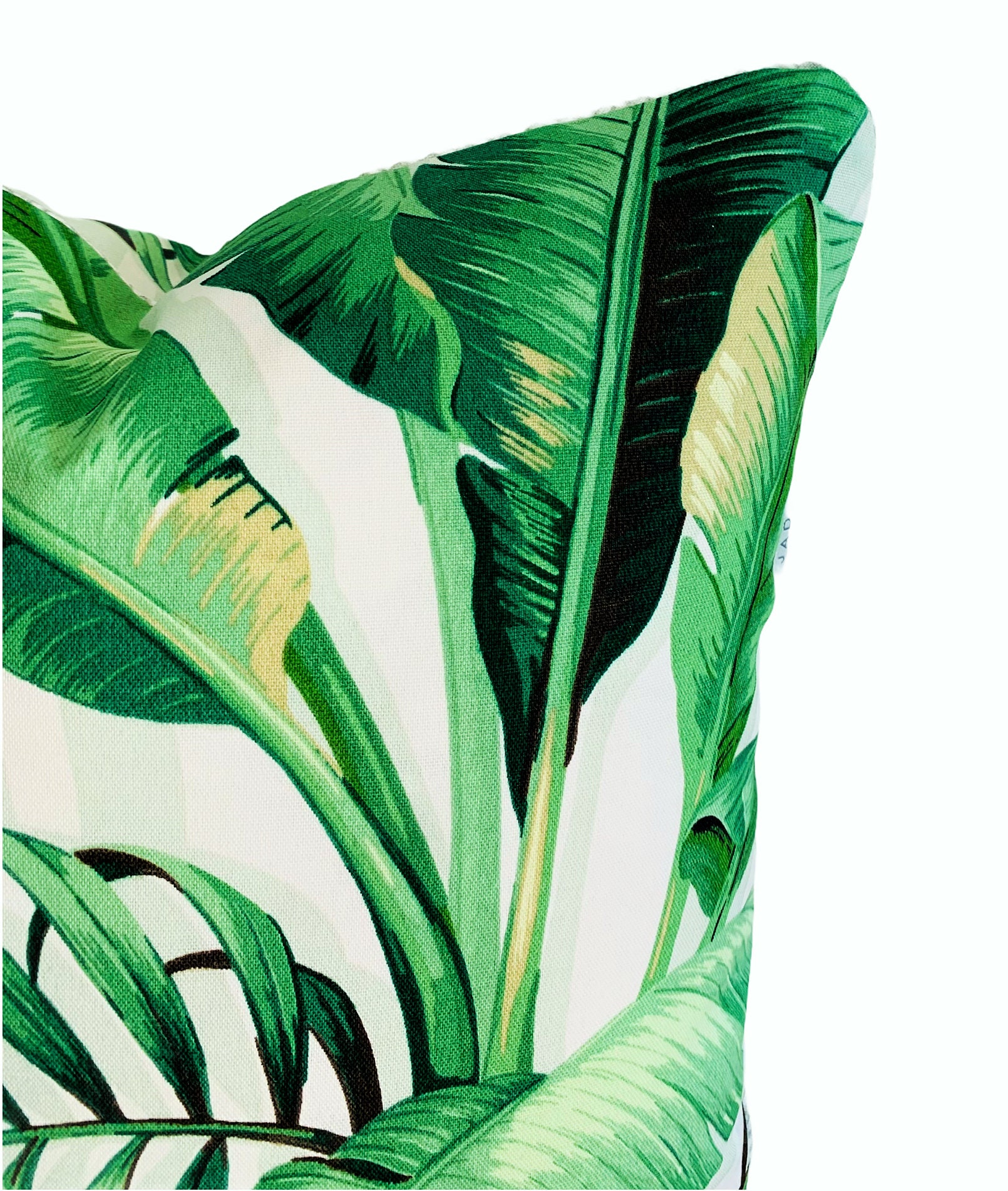 Banana and Kentia Palm leaves gives this gorgeous Indoor/Outdoor Cushion cover a lovely tropical look with ever popular soft green palette.